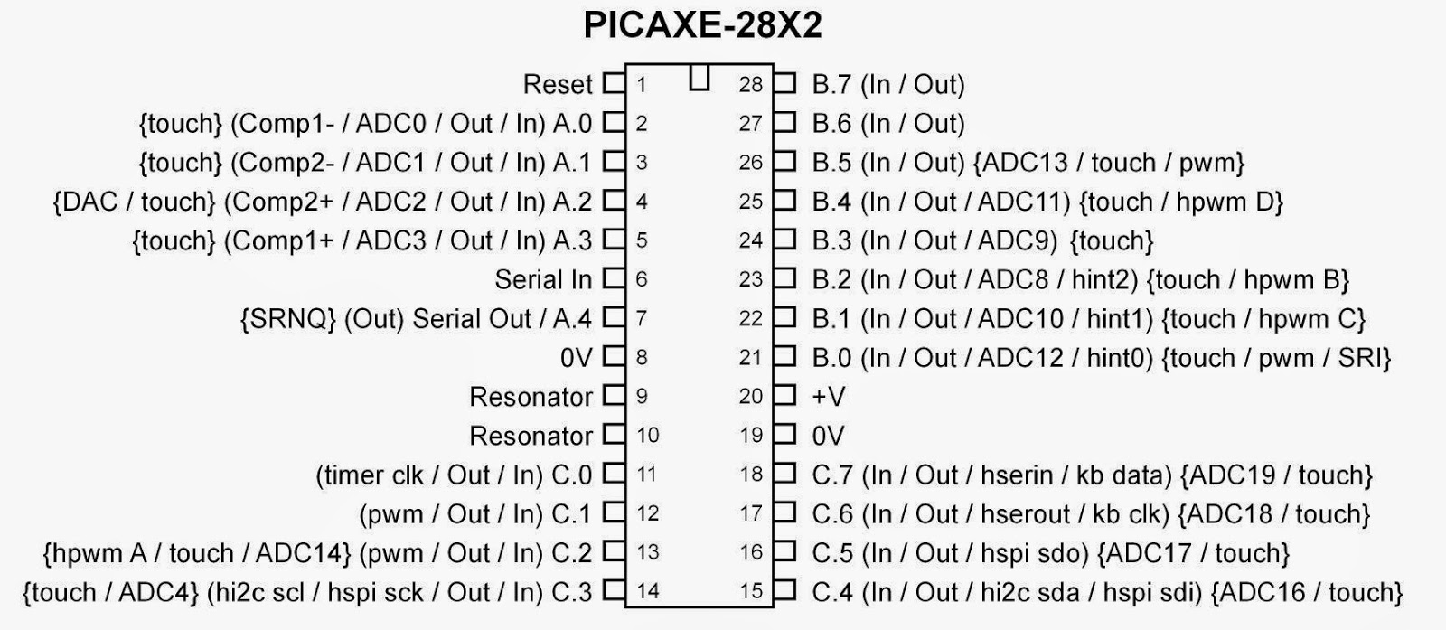 Great, but it presents and unexpected surprise: we will need 16 Input / Outputs for reading this matrix. And the Micro Pro only has 9 digital I/O pins. My first idea was to expand the number of I/O pins by using some shift registers but then I remembered I also had some PICAXE chips in my toolbox. The PICAXE is a standard PIC micro-controller, pre-programmed with a Basic interpreter which makes programming real simple.And the PICAXE 28X2 has 16 freely configurable I/O pins so that should work fine.